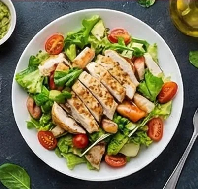 - 닭가슴살 샐러드 (새싹채소, 양파, 토마토, 올리브오일 드레싱)