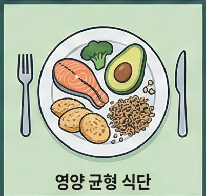 영양 균형 - 식사 시간에는 단백질, 건강한 지방, 복합 탄수화물, 채소를 골고루 섭취하세요.