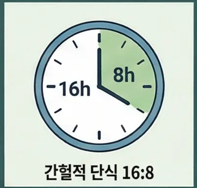 16:8 방법 - 가장 인기 있는 방식으로 16시간 공복, 8시간 식사 (예: 오전 11시~오후 7시만 식사)