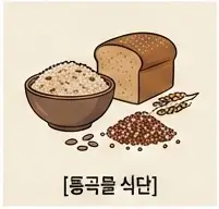 흰쌀밥과 면류를 줄이고 현미, 통밀빵, 보리, 퀴노아 등 통곡물로 대체하세요. 통곡물은 식이섬유가 풍부해 포만감이 오래 지속되고 혈당을 천천히 올립니다.