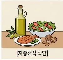 지중해식 식단은 통곡물, 채소, 견과류, 콩류, 과일, 올리브오일을 중심으로 구성하고, 가공식품, 설탕, 붉은 육류는 제한합니다.