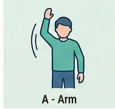 **A (Arm - 팔)**: 양팔을 앞으로 뻗었을 때 한쪽 팔이 떨어지나요?