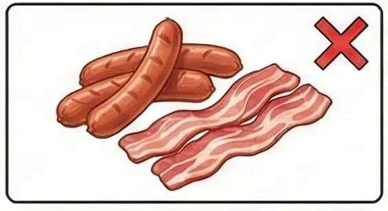 가공육: 베이컨, 햄, 소시지 등은 방부제와 나트륨 함량이 매우 높습니다.