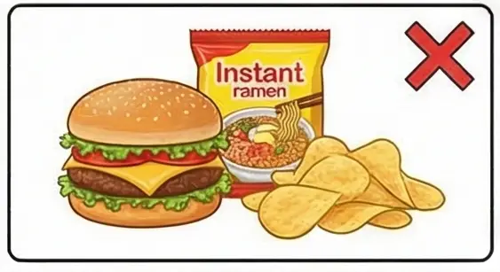 햄버거, 과자, 인스턴트 식품: 당분, 지방, 나트륨이 다량 함유되어 열량은 높고 단백질과 식이섬유는 적어요.