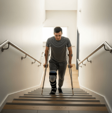 계단 내려가기: 목발 먼저 → 다친 다리 → 건강한 다리 순서입니다.
