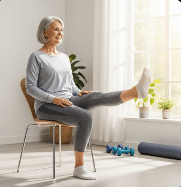 의자에 앉아 다리 들어올리기를 10회씩 3세트 반복하세요.