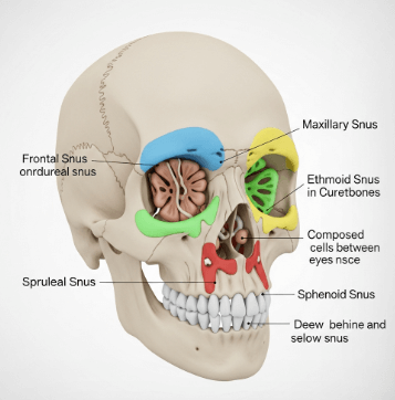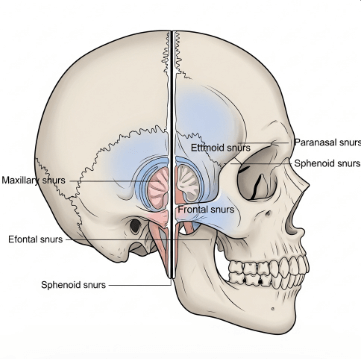 부비동암은 코 주변의 빈 공간인 부비동에 발생하는 악성 종양이에요. 부비동은 얼굴 뼈 안에 있는 동굴 같은 공간으로, 상악동·사골동·전두동·접형동 총 4쌍으로 이루어져 있습니다.