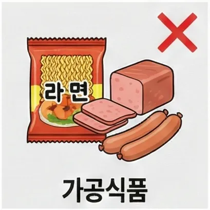 • 가공식품: 라면, 햄, 소시지 (나트륨·첨가물 과다)