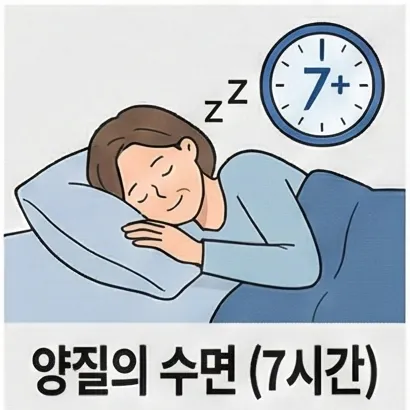 하루 7시간 이상 숙면은 다이어트 성공의 핵심입니다. 잠자는 동안 세포가 재생되고 호르몬이 조절되기 때문이에요.