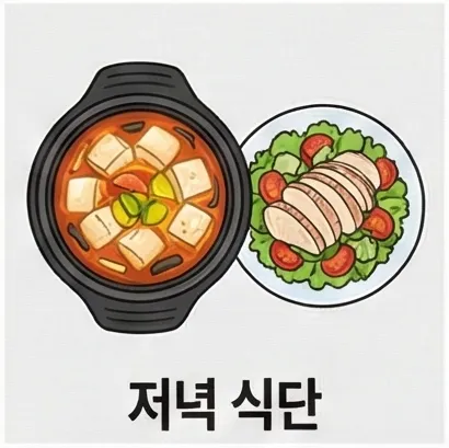 저녁은 탄수화물을 줄이고 단백질을 중심으로 가볍게 구성합니다. 늦은 저녁이라면 국물 없이 데운 순두부에 간장 한 방울만 얹어도 충분해요.