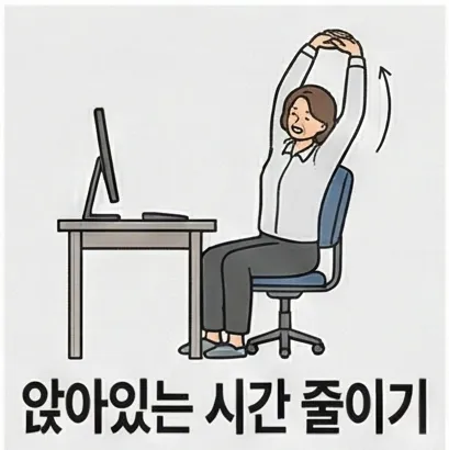 1시간마다 5분씩 일어나서 스트레칭이나 가벼운 움직임을 추가하세요. 오래 앉아 있을수록 비만과 성인병 위험이 커집니다.